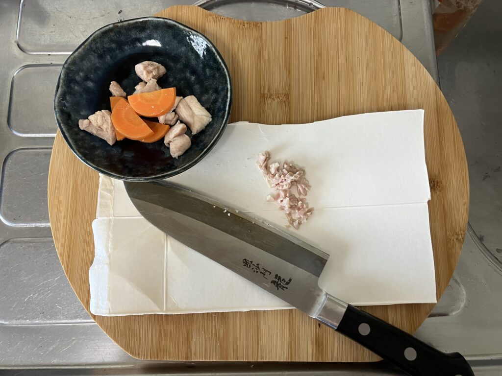 その日は買い物に行けなかったので、家にある食材でチャレンジ。鶏肉・人参を柔らかく茹でてみたところ、とても喜んで食べてくれました。自分でも作れるんだ!とびっくり。猫の健康のためにも、これからできるだけ手作りご飯を作ってあげたいと思いました。